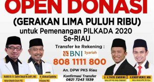 Pekanbaru – Partai Keadilan Sejahtera (PKS) Riau mengajak masyarakat ikut gotong royong #BantuPKSRiau dalam pemenangan Pilkada 2020 se-Riau, dengan cara mendonasikan sebagian rezekinya dalam program Galibu (Gerakan Lima Puluh Ribu). …